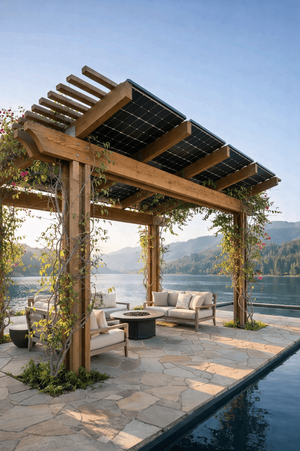 A rooftop solar pergola is a stylish outdoor structure with built-in solar panels that provides shade while generating electricity